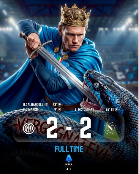 Il Napoli esce da San Siro con un pareggio pesantissimo: 2-2 contro l'Inter, in una gara intensa e piena di colpi di scena. Il volto della serata è Scott McTominay, dominante per personalità e presenza, autore di una doppietta che tiene il Napoli in partita fino all'ultimo.